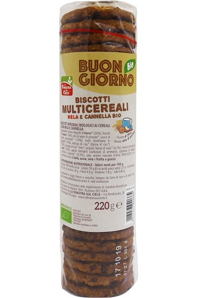 Biscotti multicereali mela e cannella Bio a base di farina di farro integrale, senza olio di palma, nella classica confezione a tubo. Sono ideali da inzuppare nelle bevande vegetali o nel thè, o anche spezzati nello yogurt per una croccantezza insuperabile.