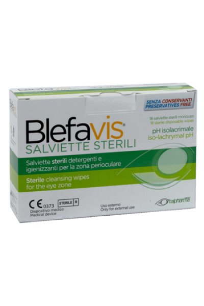 Blefavis Salviette sterili monouso è costituito da salviette imbibite con una soluzione naturale ed ottimizzata per l'uso perioculare, a pH isolacrimale e con caratteristiche detergenti, emollienti e normalizzanti della carica batterica cutanea. Blefavis salviette sterili privo di profumazioni che possono determinare rea- zioni allergiche in soggetti particolarmente sensibili, consente una detersione delicata accompagnata da un senso di freschezza e la rimozione delle secrezioni mucose e delle desquamazioni sia secche che grasse che si depositano sul bordo palpebrale e, oltre ad una normalizzazione della carica batterica, può inibire progressivamente il riformarsi delle secrezioni. Blefavis salviette sterili può essere vantaggiosamente impiegato sia nell'adulto che nel bambino.