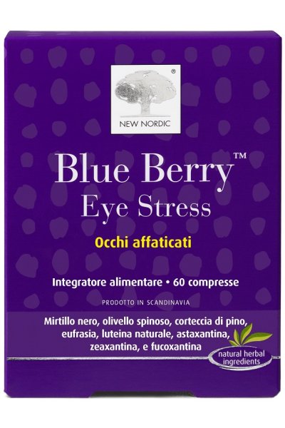 Le compresse di Blue Berry Eye Stress sono ideali per chi utilizza frequentemente computer e dispositivi digitali. Le compresse sono a base di estratti naturali di mirtillo nero nordico di cespuglio basso, bacche di olivello spinoso in combinazione con corteccia di pino marittimo francese, estratti di fiori di eufrasia e luteina estratta dalla calendula. Contengono inoltre una combinazione di estratti naturali di astaxantina, zeaxantina e fucoxantina, con in più vitamina A, niacina, zinco e rame. Vitamina A e zinco contribuiscono alla normale visione.