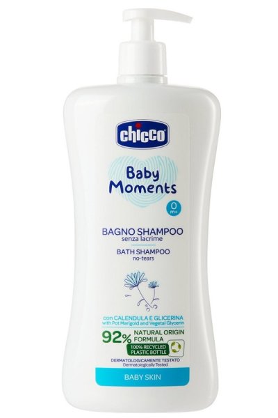 Shampoo delicato. Formula 92% di origine naturale, arricchita con estratto di calendula, emolliente, e glicerina vegetale; rispetta l'equilibrio della pelle sottile e del cuoio capelluto del neonato.