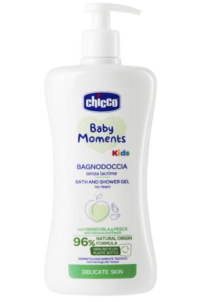 Bagnodoccia. Formula 96% di origine naturale arricchita con estratti di mandorla, addolcente, e pesca, rinfrescante; per imparare da piccoli a prendersi cura di sè.