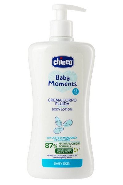 Crema corpo fluida. Formula 87% origine naturale, arricchita con latte di mandorle dolci, emolliente e nutriente; si assorbe rapidamente, non unge, idrata e mantiene soffice e setosa la pelle del neonato.