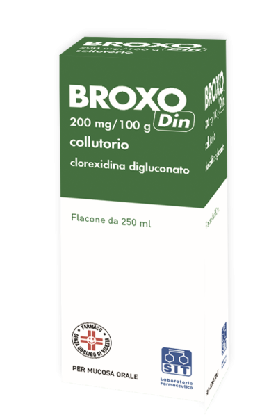 Broxo Din è un disinfettante della mucosa della bocca, contenente clorexidina digluconato che è una sostanza antibatterica.
