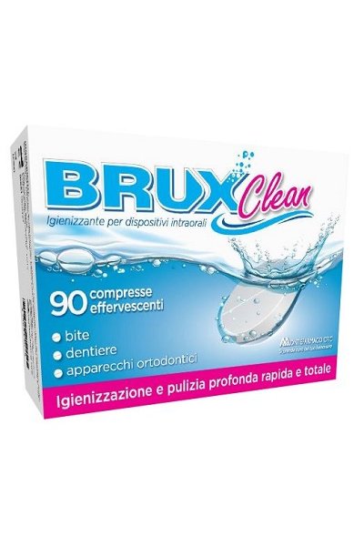 Sciacquare il dispositivo intraorale sotto l'acqua corrente ed immergerlo completamente in un bicchiere d'acqua tiepida; aggiungere successivamente una compressa di Brux Clean: l'acqua si tingerà di azzurro, sviluppando una benefica schiuma igienizzante; dopo circa 3 minuti la compressa si sarà completamente sciolta esplicando la sua azione igienizzante totale che si completerà nell'arco di 30 minuti; risciacquare il dispositivo sotto l'acqua corrente.
