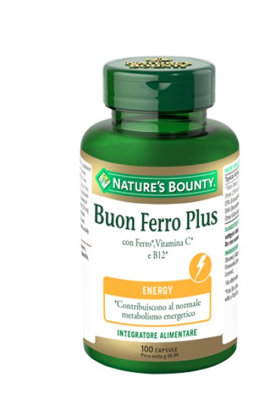 Buon Ferro Plus è un integratore alimentare a base di ferro, acido folico, vitamina C e vitamina B 12. Il ferro contribuisce alla normale formazione dell'emoglobina, al normale trasporto dell'ossigeno nel corpo e, insieme alla vitamina B12, alla normale formazione dei globuli rossi. La vitamina C accresce l'assorbimento del ferro e, insieme alla vitamina B12 e al ferro stesso, contribuisce al metabolismo energetico. Ferro, acido folico, vitamina B12 e vitamina C contribuiscono inoltre alla normale funzione del sistema immunitario e alla riduzione della stanchezza e dell'affaticamento.