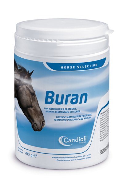 Buran è un mangime complementare indicato per cavalli adulti e puledri, con Arthrospira platensis, ananas fermentato ed edera.