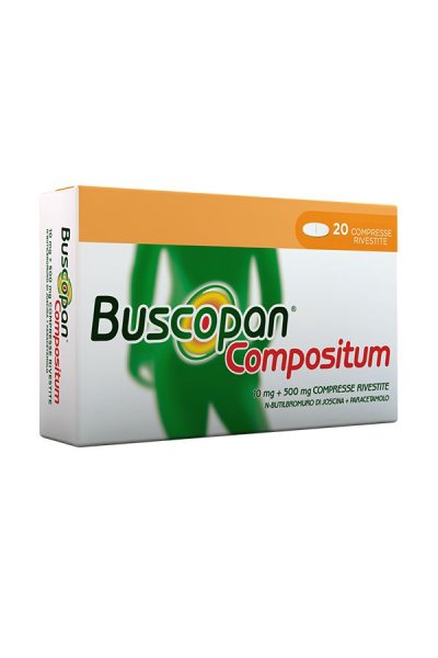 Buscopan Compositum 10 mg + 500 mg compresse rivestite Una compressa rivestita contiene: Principi attivi: N-butilbromuro di joscina 10 mg, paracetamolo 500 mg Buscopan Compositum 10 mg + 800 mg supposte Una supposta contiene: Principi attivi: N-butilbromuro di joscina 10 mg, paracetamolo 800 mg Eccipiente con effetti noti: sodio. Per l’elenco completo degli eccipienti, vedere paragrafo 6.1.