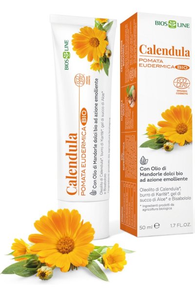 a base di Oleolito di Calendula bio, olio di Girasole bio, burro di Karitè bio, gel di succo di Aloe bio, Bisabololo e con un particolare olio di Mandorle dolci bio titolato in Beta-sitosterolo. La Pomata Eudermica Bio Calendula è indicata per un effetto calmante su pelle arrossata, irritabile ed eritematosa, su scottature e ispessimenti cutanei (gomiti, ginocchia, talloni).