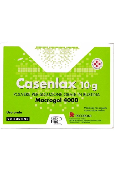 PosologiaUso orale. Posologia: Da 1 a 2 bustine al giorno, assunte preferibilmente in dose singola al mattino. L’effetto di Casenlax si manifesta entro 24–48 ore dopo la somministrazione. La dose giornaliera deve essere adattata in accordo agli effetti clinici e può variare da una bustina a giorni alterni (specialmente nei bambini) fino a 2 bustine al giorno. Popolazione pediatrica: Da 1 a 2 bustine al giorno, assunte preferibilmente in dose singola al mattino. Nei bambini, il trattamento non deve superare i 3 mesi a causa della mancanza di dati clinici nei trattamenti di durata superiore ai 3 mesi. La regolarizzazione della motilità intestinale indotta dal trattamento verrà mantenuta dallo stile di vita e da misure dietetiche. Modo di somministrazione: Ciascuna bustina deve essere sciolta in un bicchiere di acqua (circa 125 ml) appena prima dell’uso. La soluzione risultante sarà chiara e trasparente come l’acqua.