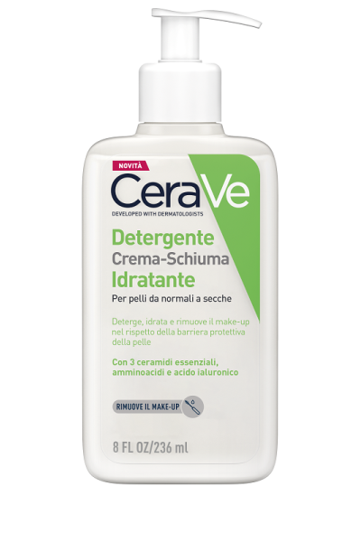 Crema schiumogena detergente idratante per pelli normali e secche. Deterge, idrata e rimuove il make up nel rispetto della barriera protettiva della pelle con 3 ceramidi essenziali, amminoacidi e acido ialuronico.