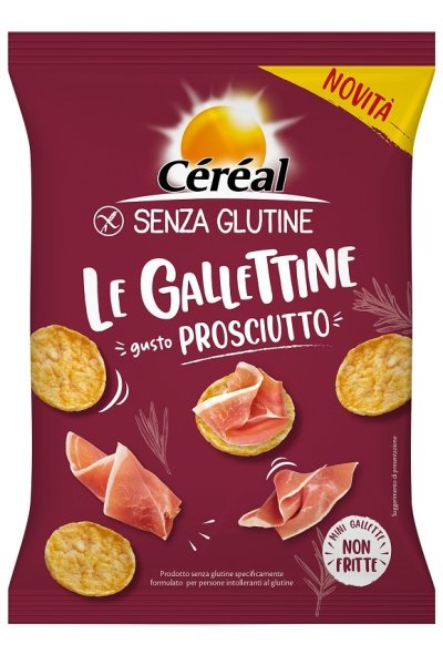 Mini gallette ai cereali al gusto prosciutto, senza glutine specificamente formulate per persone intolleranti al glutine.
