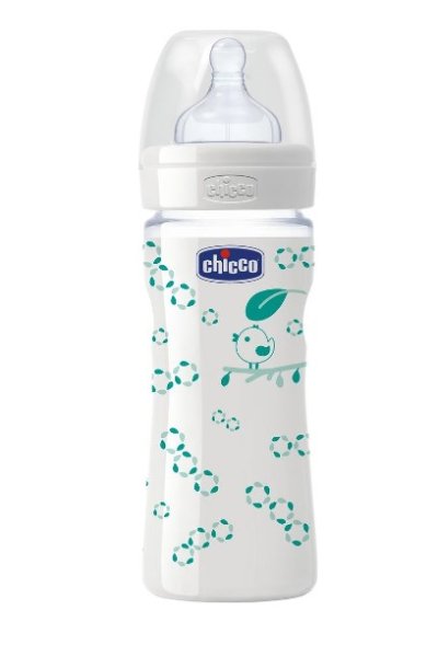 Biberon realizzato in vetro, materiale che non contiene BPA.