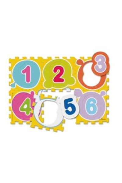 Tappeto per giocare, gattonare e scoprire i numeri. Puzzle da 6 tessere, ciascuna con la riproduzione di un numero con grafiche per il riconoscimento delle immagini. I 6 numeri sono staccabili dalla base. Lavabili in superficie.