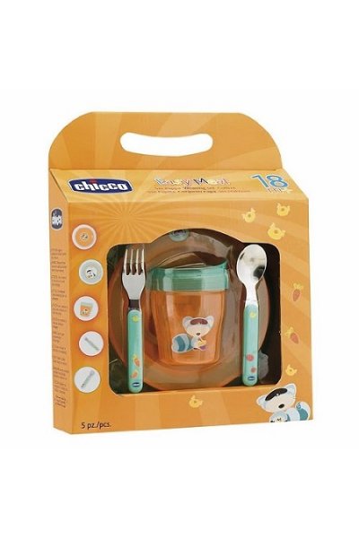 Il set comprende: un piatto fondo antiscivolo, un piatto piano antiscivolo, un bicchiere, un cucchiaino ed una forchetta in acciaio inox.