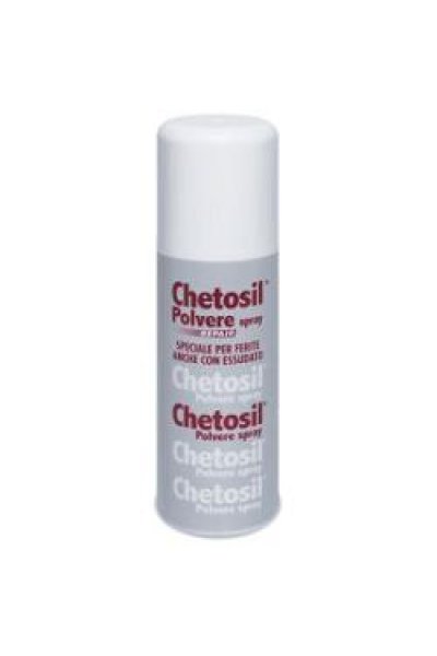 Dispositivo medico, classe III. Lo ione d’argento Ag+ è la forma antimicrobica attiva efficace contro più di 650 diversi tipi di batteri, parassiti, funghi e virus senza essere tossico ed avere effetti collaterali. Chetosil è la polvere spray con una elevata concentrazione di ioni Ag+ in grado di svolgere una potente azione antimicrobica e accurata protezione da infezioni esogene. Oltre agli ioni di argento attivi, lo spray contiene sodio ialuronato, per mantenere l’ottimale microambiente umido della ferita, e caolino in grado di assorbire essudati e materiali necrotici.Modalità d'uso