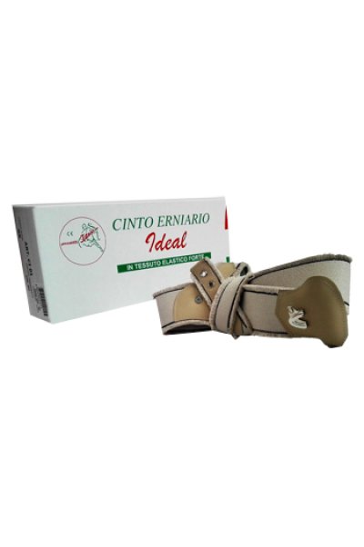 Cinto erniario per contenzione di ernia. Il prodotto è in tessuto elastico grigio con bordo frangiato, semplice (DX o SX) o doppio. Inoltre il Cinto Erniario Ideal ha una pelotta removibile, e una fibbia di regolazione per la vestibilità.