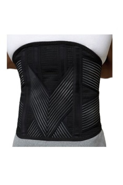 Cintura lombare di 35 cm di altezza, con doppia chiusura a strappo, 4 stecche posteriori e incrocio posteriore di rinforzo.