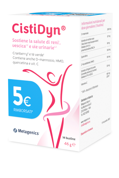 CistiDyn contiene cranberry (Estratto di mirtillo rosso) che contribuisce alla funzionalità delle vie urinarie. La formulazione di CistiDyn è stata ottimizzata con l’aggiunta di 2-‘fucosillattosio [Human Milk Oligosaccha ride (HMO) - brevetto Care4U] e di un elevato dosaggio di D-mannosio. CistiDyn contiene anche quercetina e vitamina C.