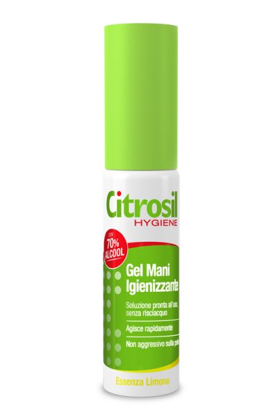 Citrosil Hygiene Gel Mani garantisce un'efficacia igienizzante. La sua speciale formula con una concentrazione di alcool del 70% agisce senza l'utilizzo di acqua, si asciuga rapidamente senza bisogno di salviettine e non è aggressiva sulla pelle. Essenza limone. No gas.