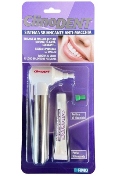 ClinoDENT consente di rimuovere le macchie dentali provocate da agenti esterni (fumo, caffè, tè, alimenti coloranti, clorexidina, etc.) svolgendo contemporaneamente un'azione di profonda pulizia e lucidatura dello smalto dentale.