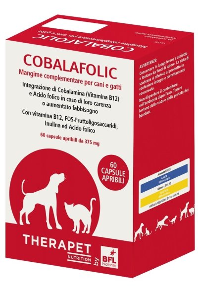 Mangime complementare per cani e gatti in capsule formulato con vitamina B12, acido folico e complesso pre-postbiotico come integrazione di cobalamina (vitamina B12) e acido folico in caso di loro carenza o aumentato fabbisogno.