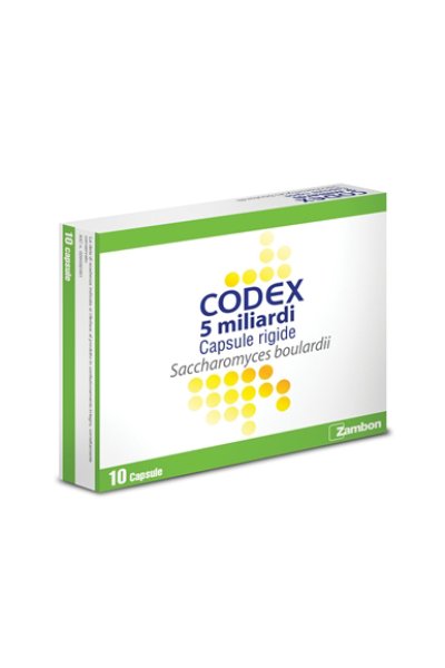 Codex 5 miliardi capsule rigide Ogni capsula contiene: principio attivo: Saccharomyces boulardii 5 miliardi di germi vivi (sotto forma di 250 mg di polvere liofilizzata). Per l’elenco completo degli eccipienti, vedere paragrafo 6.1.