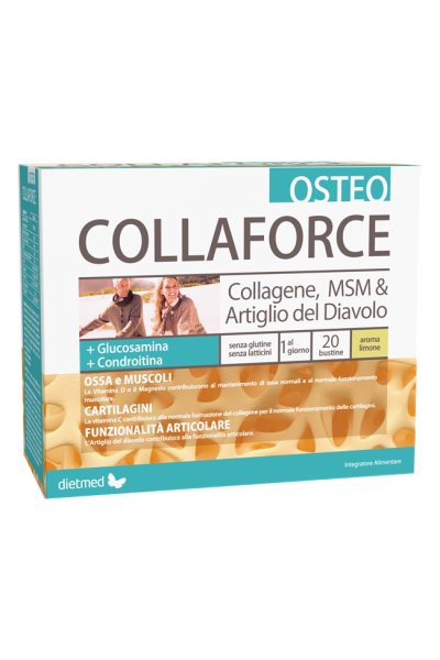 Collagene idrolizzato enzimaticamente; correttore di acidità: acido citrico; sali di calcio dell'acido ortofosforico, solfato di glucosamina (prodotto a base di crostacei), solfato di condroitina (prodotto a base di pesce), aroma di limone, maltodestrina, ossido di magnesio, acido L-ascorbico (vitamina C), Harpagophytum procumbens DC (artiglio del diavolo, estratto secco di radici secondarie titolato minimo al 2% in arpagosidi), metilsulfonilmetano (MSM), ialuronato di sodio; edulcoranti: sucralosio, saccarina sodica; colecalciferolo (vitamina D).