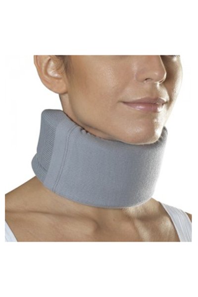 Collare cervicale morbido con chiusura a strappo e guaina di protezione, limita i movimenti del rachide cervicale.
