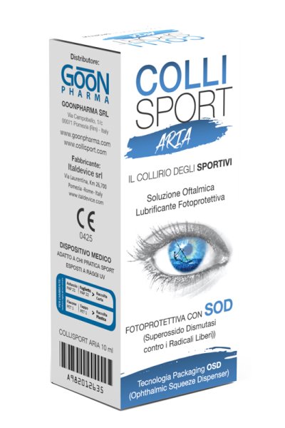 Soluzione oftalmica lubrificante e fotoprotettiva appositamente formulata per coloro che svolgono attività sportive all’aperto e sono più esposti a fenomeni di stress ossidativo a carico degli occhi. L’occhio, a causa della sua struttura e della sua posizione anatomica, è in perenne contatto con la luce ed è uno degli organi che più subisce l’azione dei radicali liberi, in maniera diretta e indiretta. L’esposizione alle radiazioni luminose determina un aumento della fisiologica concentrazione di ROS (radicali liberi), responsabili di reazioni ossidative corneo congiuntivali. Uno dei sistemi enzimatici preposti a svolgere l’attività antiossidante è la Superossido dismutasi (SOD) ed è presente in Collisport aria allo scopo di proteggere gli occhi da danni foto indotti. La presenza inoltre di sostanze ad azione lubrificante assicura una corretta idratazione della superficie oculare evitando i fastidiosi sintomi legati a secchezza e arrossamento. In Collisport aria è utilizzata la tecnologia OSD (Ophthalmic Squeeze Dispenser), un nuovo sistema di erogazione delle gocce, che consente l’assoluta sterilità del prodotto, senza l’utilizzo di conservanti.