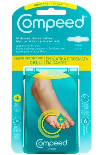 Cerotto ideato per aiutare a prevenire i calli grazie alla sua imbottitura e alla continua idratazione. La tecnologia dell'Idrocolloide Compeed per la prima volta associata al siero idratante inserito nel cuore del prodotto per rilasciare un'idratazione prolungata e mirata agli strati di pelle indurita, proteggere contro lo sfregamento e la pressione e donare sollievo dal dolore della pressione e della pelle indurita che forma il callo.