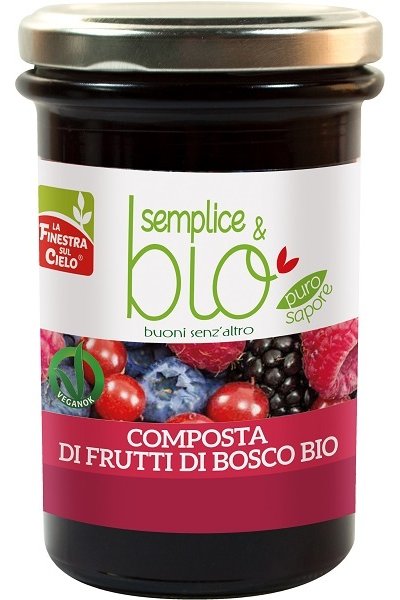 Frutti di bosco* in proporzione variabile (lamponi*, more*, ribes*, mirtilli*) (70%); polpa di mela concentrata* (29,1%); gelificante: pectina.