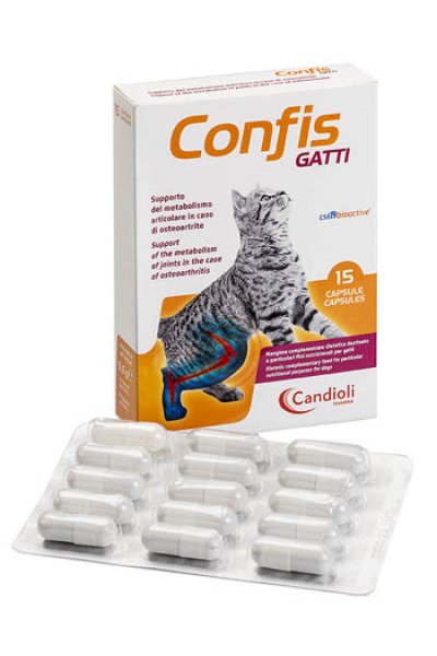 Mangime complementare dietetico destinato a particolari fini nutrizionali per gatti. Formulato per il supporto del metabolismo articolare in caso di osteoartrite. Confis Gatti è presentato in capsule contenenti una polvere appetibile.
