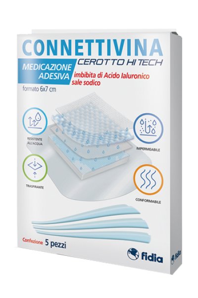 Connettivina cerotto Hi Tech è in grado di creare un ambiente umido nel sito di applicazione, protetto verso l'esterno, tale da favorire il naturale processo di riparazione tessutale in caso di escoriazioni, abrasioni, piccoli tagli, ferite superficiali, scottature.