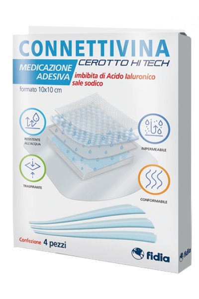 Connettivina cerotto Hi Tech è un dispositivo medico per uso cutaneo costituito da un bordo adesivo trasparente in poliuretano e un tampone centrale assorbente multistrato imbibito di una soluzione di acido ialuronico sale sodico allo 0,3%.