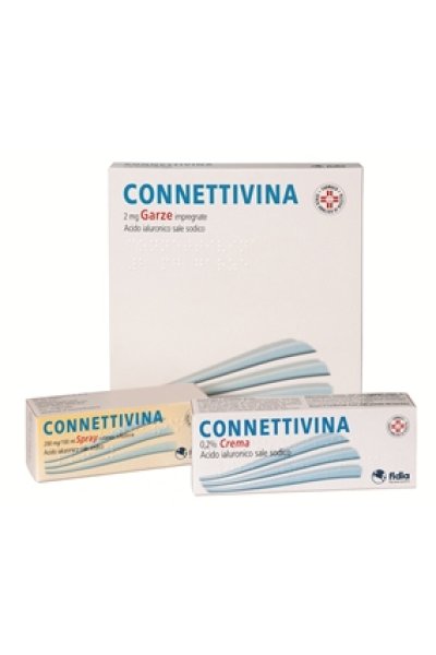 CONNETTIVINA 2mg/ ml Spray cutaneo, soluzione: 1 ml contiene 2 mg di Acido ialuronico sale sodico. Eccipienti con effetti noti: metil p–idrossibenzoato e propil p–idrossibenzoato. CONNETTIVINA 2 mg Garze impregnate: una garza da 10x10 cm è impregnata con 4 g di crema contenente 2 mg di Acido ialuronico sale sodico. CONNETTIVINA 4 mg Garze impregnate: una garza da 10x20 cm è impregnata con 8 g di crema contenente 4 mg di Acido ialuronico sale sodico. CONNETTIVINA 12 mg Garze impregnate: una garza da 20x30 cm è impregnata con 24 g di crema contenente 12 mg di Acido ialuronico sale sodico Eccipiente con effetti noti: polietilenglicole 4000. Per l’elenco completo degli eccipienti, vedere paragrafo 6.1