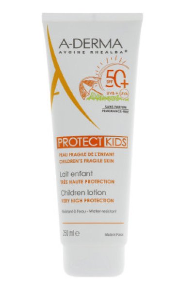 Dotato di un sistema di filtraggio SPF50+ alto, il latte solare A-Derma ProtectKids offre al bambino una vera protezione contro le scottature e rinforza la barriera cutanea attraverso la combinazione di Barriestolide ed avena Rhealba.
