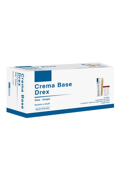L'astuccio contiene una Crema Base Drex, un contenitore graduato con coperchio a vite sterile e una paletta sterile. Ciò consente di miscelare la Crema Base Drex con qualsiasi altra emulsione contenente altri principi attivi; in tal caso miscelare la Crema Base Drex all'interno del contenitore graduato, aggiungere l'altra emulsione, mescolare accuratamente e chiudere il tappo.