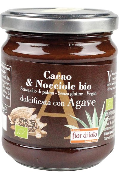 Crema spalmabile al Cacao e Nocciole con Agave biologici. Senza olio di palma e adatto ai vegani.