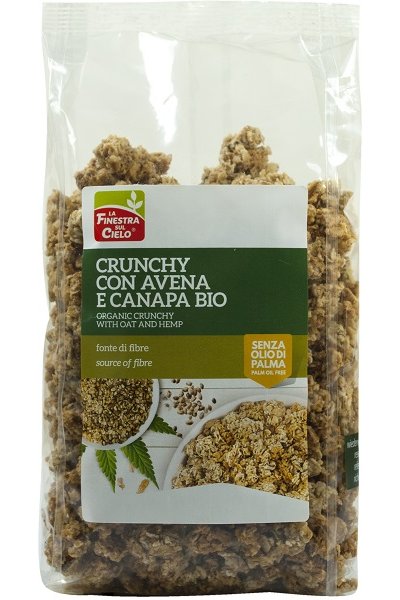 Prodotto biologico con fiocchi di avena e semi di canapa, ricco in fibre, senza olio di palma.