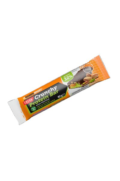 Barretta proteica (al 32%) con cioccolato fondente, strato di caramello e fiocchi di soia.