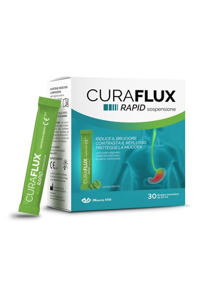 CURAFLUX RAPID sospensione è un dispositivo medico ad azione meccanica in forma di sospensione a base di sodio alginato, sodio bicarbonato e calcio carbonato. È formulato per proteggere la mucosa dell'esofago mediante il blocco del reflusso e la riduzione del bruciore. Grazie alla presenza del sodio alginato crea una barriera protettiva che galleggia a livello dello stomaco e previene il reflusso e la risalita del contenuto acido verso l'esofago, riducendo i sintomi associati, come il bruciore.