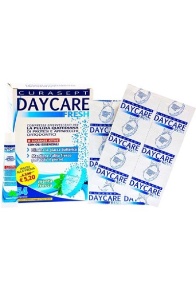 Compresse effervescenti per la pulizia quotidiana di protesi e apparecchi ortodontici.