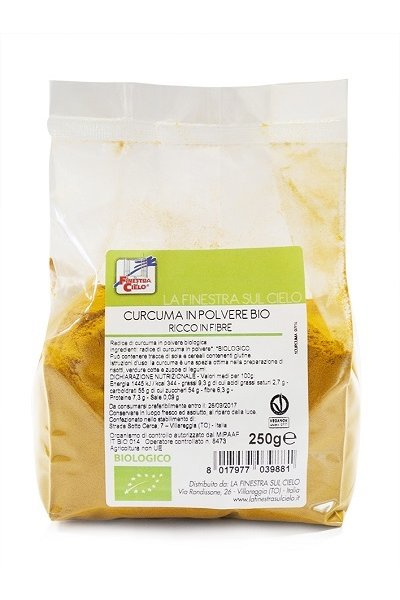 Radice di curcuma in polvere biologica, ricco di fibre. Prodotto adatto ai vegani.