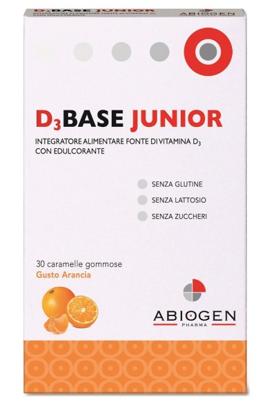 Integratore alimentare fonte di vitamina D3 (colecalciferolo) in forma di caramelle gommose con edulcorante. D3Base Junior è indicato per i bambini dai 4 anni in su. D3Base Junior è adatto per integrare le esigenze nutrizionali di vitamina D3 del bambino quando il fabbisogno giornaliero non è assicurato. La vitamina D3 si forma quasi esclusivamente in seguito all'esposizione della cute alla luce solare. Gli alimenti infatti ne contengono quantità limitate ed è dunque altamente improbabile riuscire a coprire il fabbisogno attraverso la normale alimentazione. Gusto arancia.