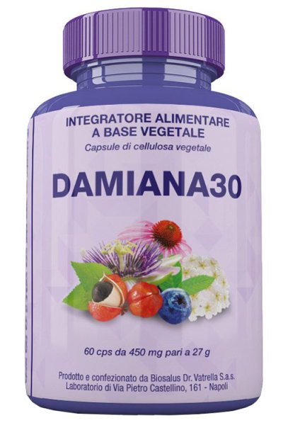 Damiana (Turnera diffusa Will.) foglie e sommità e.s. 350 mg, amido pregelatinizzato; costituenti delle capsule: cellulosa vegetale.