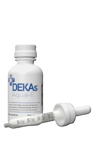 Non utilizzare se la guarnizione è rotta o mancante. DEKAs Aqua-E deve essere usato sotto controllo medico, in bambini oltre i tre anni di età e nell'adulto affetti da epatopatia colestatica. La somministrazione della vitamina E in forma idrosolubile rende idoneo l'alimento alla supplementazione vitaminica nella gestione dietetica dell'epatopatia colestatica. Non può essere utilizzato come unica fonte di alimentazione. Il prodotto può comportare rischi per la salute se consumato da persone non affette dalla malattia, dal disturbo o dallo stato patologico per cui il prodotto è indicato. Il medico dovrà valutare l'opportunità di utilizzare il prodotto in pazienti con insufficienza renale significativa, con deficit di vitamina K o in corso di trattamento con anticoagulanti per via orale, durante la gravidanza. Tenere fuori dalla portata dei bambini.