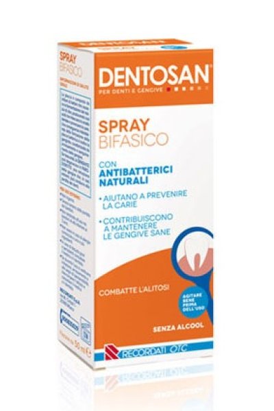 Dentosan Spray Bifasico è una soluzione bifasica (olio-acqua) con antibatterici naturali che aiutano a prevenire la carie e contribuiscono a mantenere le gengive sane. Non macchia i denti. Combatte l'alitosi.