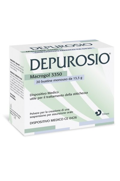Dispositivo medico lassativo che, attraverso l'azione osmotica, regola l'intestino in modo naturale. Non viene assorbito né fermenta nell'intestino, non irrita la mucosa e viene eliminato con le feci. DEPUROSIO è particolarmente indicato in caso di stitichezza cronica e occasionale e di intestino irregolare. Infatti, grazie alla sua affinità per l'acqua, DEPUROSIO ammorbidisce le feci facilitandone l'evacuazione senza causare crampi, dolori addominali o condizioni di emergenza. La sua efficacia non si riduce nel tempo.