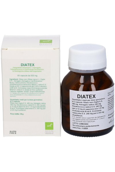 Ingredienti: Ribes nero (Ribes nigrum L.) foglie E.S., Astragalo (Astragalus membranaceus Bung.) radice polvere, Eleuterococco (Eleutherococcus senticosus Maxim.) radice E.S. titolato al 5% in saponine ed allo 0,8% in eleuterosidi B ed E, Echinacea rossa (Echinacea purpurea Moench.) erba E.S. titolato al 4% in polifenoli. Idrossi-propil-metilcellulosa (capsula vegetale). E.S.: Estratto secco supportato da maltodestrine, con rapporto pianta secca/estratto 4:1 o fino al titolo dichiarato dove specificato.