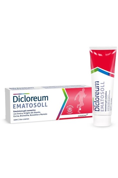 Gel cosmetico con arnica, artiglio del diavolo, escina, bromelina, Boswellia e mentolo, studiato per favorire il benessere della pelle. In particolare, svolge un'azione lenitiva e agisce per mantenere le normali condizioni cutanee in caso di contrasti imprevisti che possono capitare durante le attività della vita quotidiana o sportiva. Dona un'immediata e prolungata sensazione di freschezza. Dicloreum Ematosoll gel è una formulazione innovativa in quanto alcune delle sostanze funzionali sono formulate in liposomi (bromelina) e fitosomi (escina e boswellia), che ne favoriscono l'efficacia e la permanenza a livello cutaneo. Si assorbe rapidamente, senza ungere.